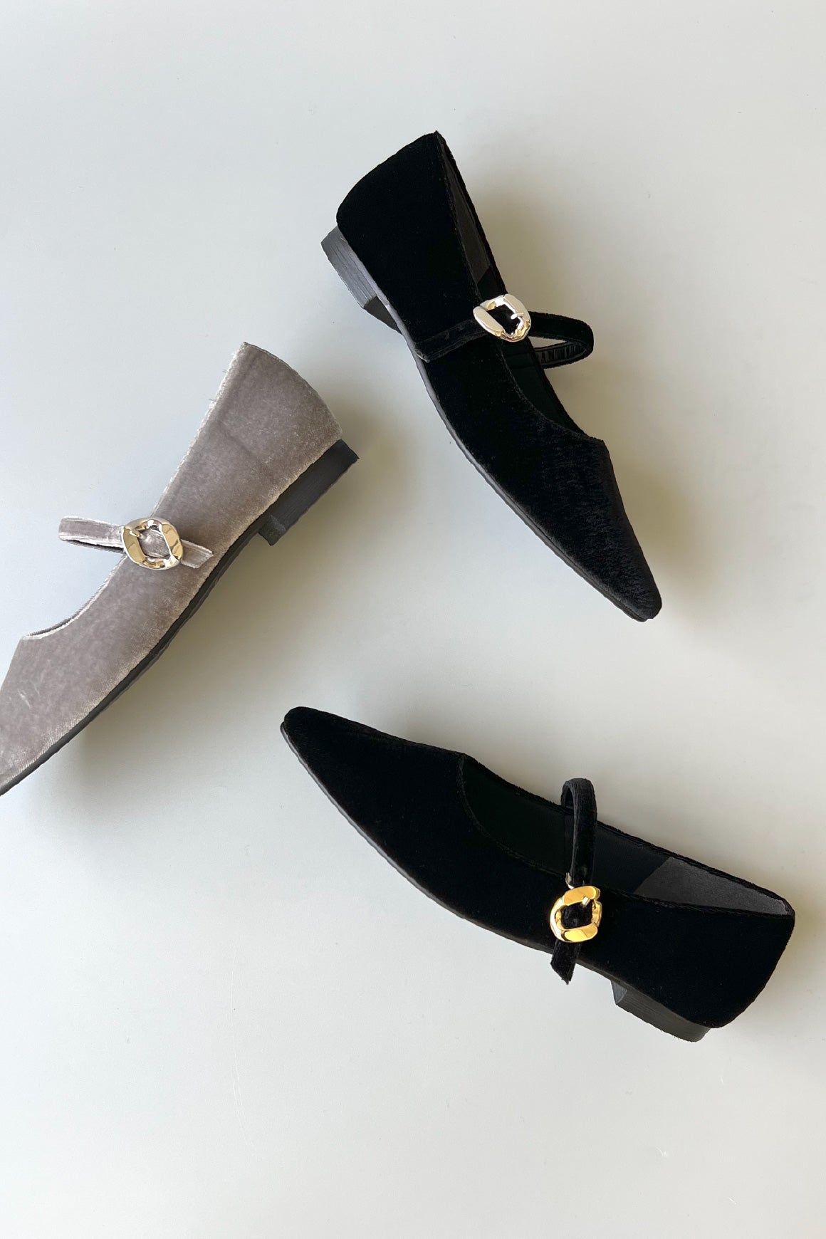 ニュアンスのある柔らかなグレーが、足元に洗練された抜け感を演出します。ベルベット特有の光沢により、シルバーのような品の良い輝きを放ち、モノトーンコーデやカラータイツとも相性抜群です。